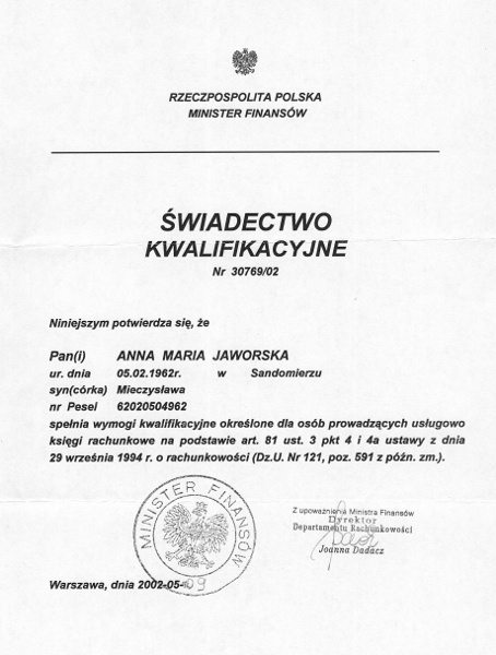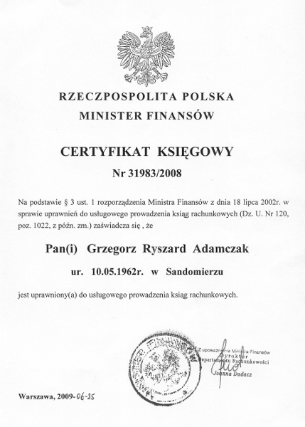 Informujemy, że Biuro Rachunkowe prowadzone przez naszą firmę posiada uprawnienia Ministra Finansów Nr 30769/02 i Nr 31982/2008 do usługowego prowadzenia ksiąg rachunkowych.